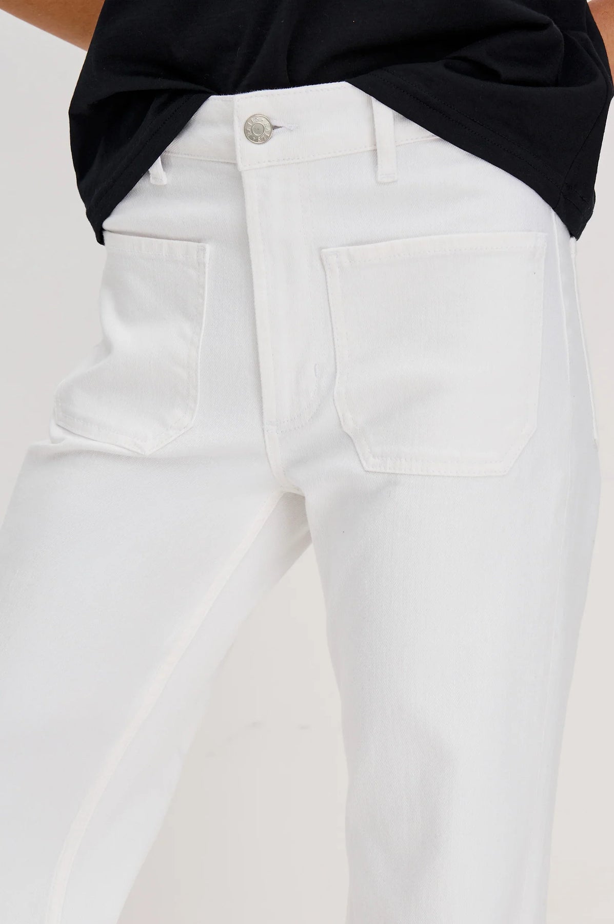 Alamitos nas vraća u retro inspiriran krojem 70-ih s visokim strukom i raspljenušim nogavicama, izrađen od udobnog rastezljivog trapera s prednjim džepovima u patch stilu.