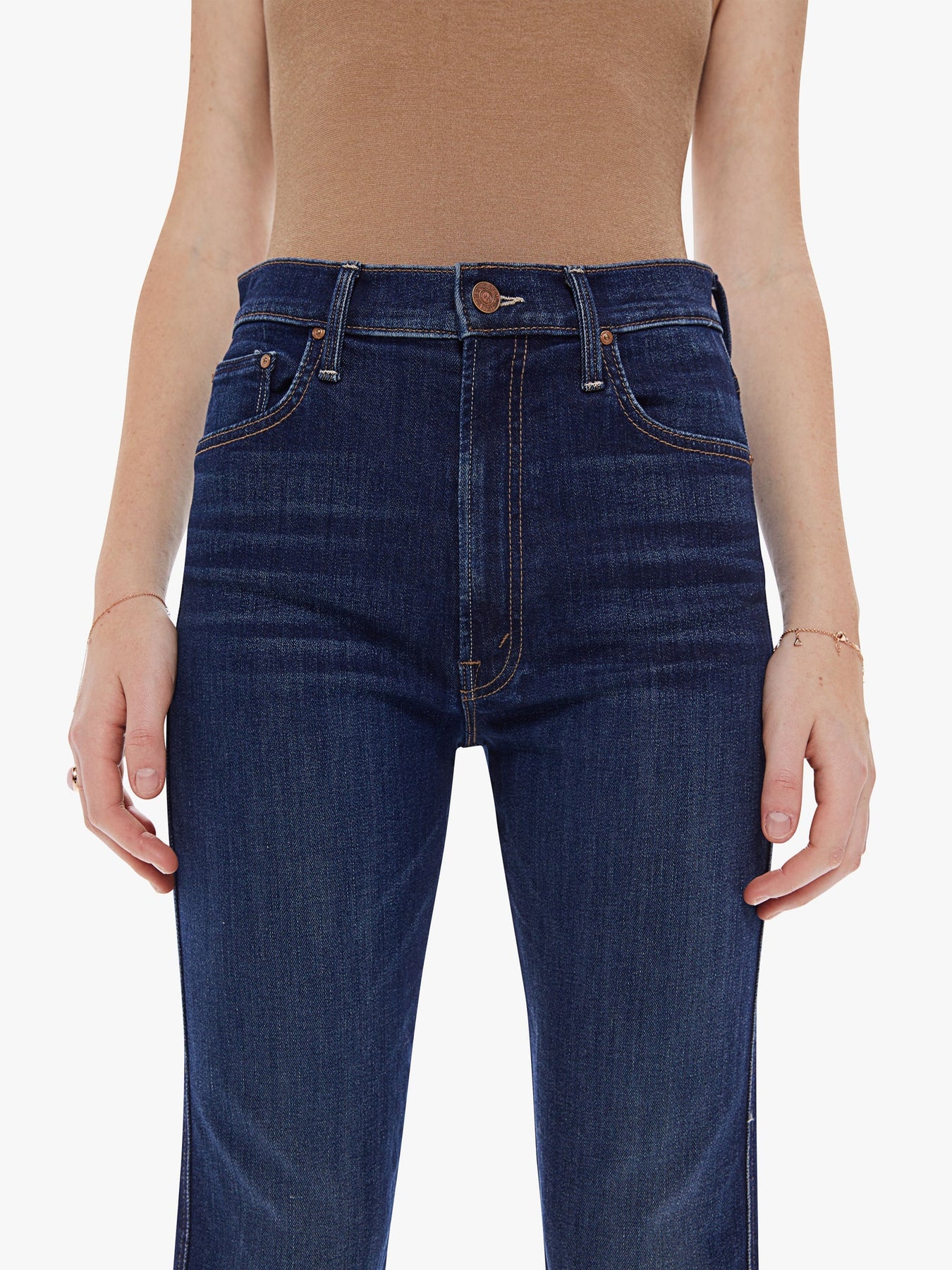 Plave traperice od Mother sa savršenim, ravnim nogavicama i visokim strukom. Malo rastezljive.