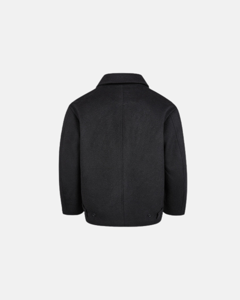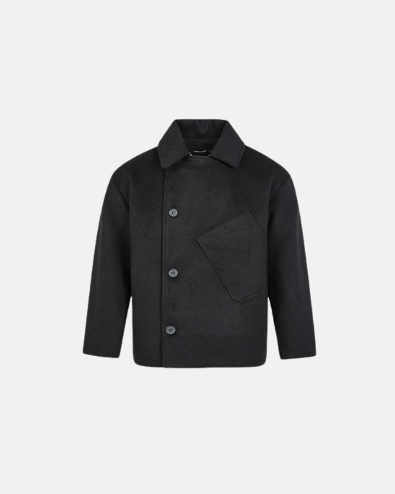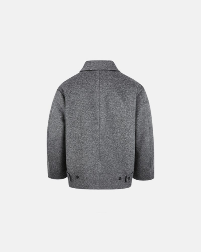 Ova moderna vuna jakna ističe se svojim čistim krojem i upečatljivim asimetričnim dizajnom prednjeg džepa. Izrađena od meke, srednje teške mješavine sive vune, nudi toplinu i strukturu bez žrtvovanja udobnosti. Minimalističko zatvaranje na gumbe sprijeda i oštri ovratnik stvaraju profinjenu siluetu, dok jedinstveni kutni džep dodaje suvremeni dodir—savršeno za podizanje kako ležernih, tako i pametno-ležernih izgleda.