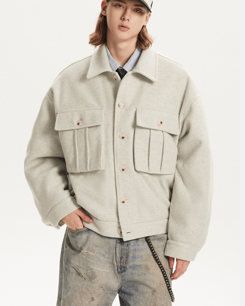 Ova predimenzionirana jakna za funkcionalnu upotrebu kombinira urbani stil s čistim, strukturiranim dizajnom. Izrađena od meke tkanine od vune u svijetloj neutralnoj nijansi, sadrži naglašene džepove s preklopima i nabranim detaljima za hrabar, funkcionalan izgled. Završena klasičnim ovratnikom, zatvaranjem na dugmad i spuštenim ramenima, omogućuje jednostavno slojevito oblačenje i moderni uniseks kroj—savršena za izražavanje individualnog stila dok ostajete topli i udobni.