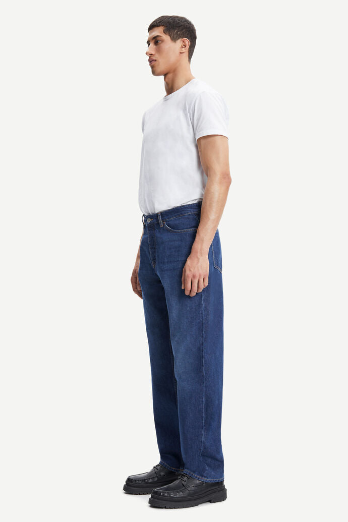 Plave ‘Eddie’ traperice iz Samsoe Samsoe. Napravljene od ekološkog pamuka, ovaj par ima ravne nogavice i zatvaranje na patentni zatvarač s gumbom, klasičnih pet džepova i bež oznaku straga.